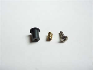 While lookin' for t' right parts, ya bilge rat, I came across t' drawer o' Rawl nuts©. Blimey! (Some stores carry WELLNUT brand) These are top hat shaped rubber plugs that have an integrated brass nut at t' narrow end. They are used for securin' items t' most any material by insertin' into a pre-drilled hole and then screwin' in t' appropriate size screw. T' screw pulls t' integrated nut closer t' t' flanged end expandin' t' diameter o' t' plug which tightens it in t' hole. Arrr! But I digress here. Arrr! T' shape o' t' Rawl nut be perfect and it already had one highly conductive brass insert molded into t' narrow end. Aye aye! Avast! My idea was t' find another threaded brass insert t' screw or glue into t' flanged end, leavin' a gap betwixt t' existin' insert and solderin' stranded wires t' t' two nuts. Begad! Ahoy! Insertin' a low profile stainless steel truss head screw would connect t' two inserts completin' t' circuit.