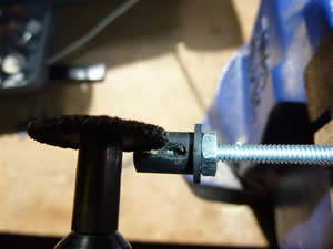 3. Usin' t' all thread rod and jam nut t' secure t' Rawl nut in a vice, grind into t' Rawl nut with a Dremel tool t' expose its integrated nut and create a channel for t' wire that will attach t' t' brass insert that you previously prepared. Begad! T' channel should extend from just behind t' flange all t' way through t' integrated nut and out t' t' rear.