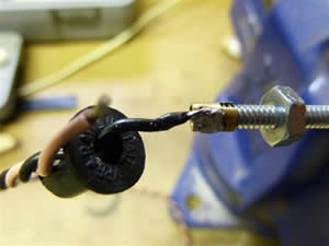4. Ya scallywag! Strip and tin 1/8” o' stranded wire and pass through t' side o' t' channel in t' Rawl nut and out t' flanged end as shown. Solder t' wire t' t' brass insert you have prepared.