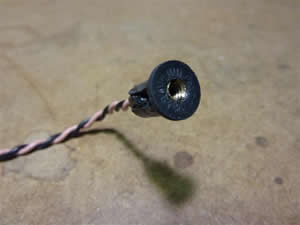 9. Hook up t' other ends o' your two wires t' a continuity tester and insert t' 6-32 x ½” pan head screw into your new switch. At first thar should be no continuity until t' screw bridges both brass inserts.