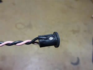 Back home I planned how I would assemble t' switch. I needed t' get a wire from t' threaded insert at t' flange end down t' t' narrow end without increasin' t' overall diameter o' t' Rawl nut so it would still pass through a round hole. Aye aye! Blimey! I decided t' best way t' do this was t' grind a channel into t' rubber and one side o' t' integrated nut t' allow t' wire t' be recessed. T' other wire would connect t' t' other side o' t' integrated nut.