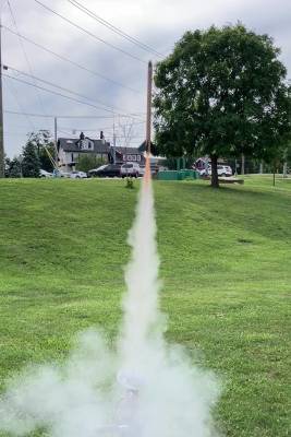 Pretty much a fire & forget flight. I fired it and forgot how fast rockets like these get out o' sight. I was lookin' up and seein' zip, but I heard t' ejection charge. Still nothing, but I heard an impact over near t' parkin' area. Blimey! T' Knight had kicked t' motor and nay t' streamer. Impacted t' sidewalk like a tiny little missile. Arrr! Thud recovery. Either dead or shorter now.