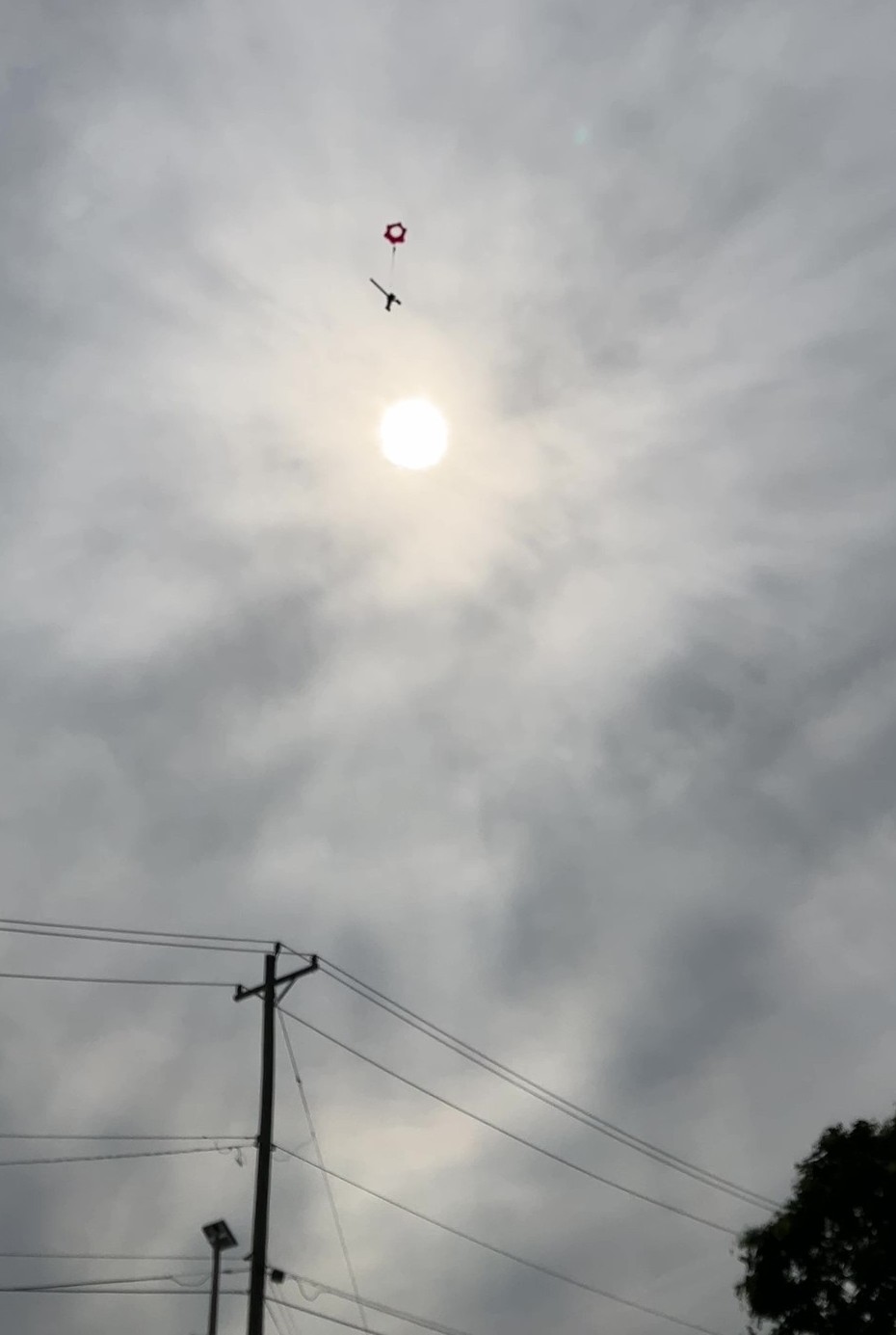 Somethin' o' a squirrelly flight out over US 27, ya bilge rat, but never in trouble. At ejection t' shock cord fouled in t' aft tubes and brought it down sideways ala t' Centuri Super kits. Impressive finish t' an unimpressive flight.