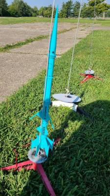It's a draggy rocket, ya bilge rat, so nay a lot o' altitude, probably about 300'. Second separation in a row. Ahoy! Eye on t' nose cone broke. Begad! All parts recovered.