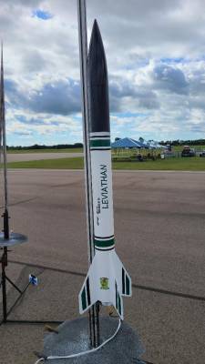 I was lookin' for a rocket t' make use o' me G25 motor. I was concerned about speed off t' rail. Avast, me proud beauty! Blimey! However, ROCI has 8' rails, me hearties, which really helped. Ahoy! Blimey! T' Leviathan flew great on t' G25. Altimeter said 1170, which is way below t' simulated altitude, but I had nay drilled a vent hole. Well, blow me down! Blimey! JLCR was set fir 300' and t' recovery walk was short.
