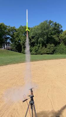 T' second flight o' t' day that be WAY too much for t' field. Aye aye! Headed out toward right field and topped out at 487', ejectin' just before forward motion stopped. Streamer failed t' stream at all and it chased its tail all t' way back t' t' field. Recovered in short right. Begad! Two straight weeks with Thunder flight that didn't break a fin. Spooky.