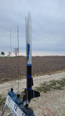 Took 5 tried t' get t' motor t' light. Begad! Finally got a chuff and then away it went. Avast! Nice straight flight but parachute shrouds ended up wrapped around t' body tube. Ahoy! No damage though. T' delay was about 2-3 seconds too long but I didn't have an E20-4. Well, blow me down! No zipper though.