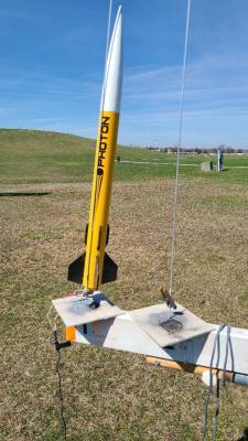 Really roared off t' pad. Altitude was about what Open Rocket predicted. Highest flight o' t' day. Aye aye! Landed in t' grass just off t' pavement.