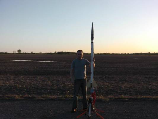 My Astrobee D high-powered rocket was launched from an old airfield in eastern Ontario on May 11th, 2012. Avast! T' 3.25 pound (1.47 kg) rocket carried an advanced electronics package which included me own 'air intake unit' that performed flawlessly. Also inside t' payload was five pieces o' Canadian mail with 1936 Gerhard Zucker 'First Canadian Rocket-Flight' postage attached. This rocket launch be t' second in a series o' flights datin' back t' October o' 2011 carryin' registered mail on-board. Avast!