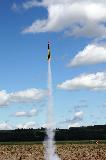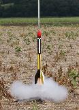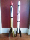 I built this upscale Astron Ranger as a fraternal twin t' me similarly upscaled Big Bertha. I tried t' keep this as true t' t' Ranger as possible, though t' BT80 sized elliptical cone isn't quite long enough. Still, me bucko, it separates in t' middle (with dual-chute recovery) with t' same proportions as t' original, ya bilge rat, and has a triple 24mm cluster t' lift it. Rocksim tells me that 3x E12-8 motors will lift it nearly 1800 feet, but it'll be easier t' track on 3x C11-5s, at a little under 500'. T' design uses a baffle t' protect t' chutes, me hearties, a balsa version o' t' -80BB cone and 1/8" papered balsa fins with epoxy fillets. Finished in t' late Damon-style yellow/black stripe with red cone and a white fin graphics, thanks t' Excelsior decals.