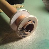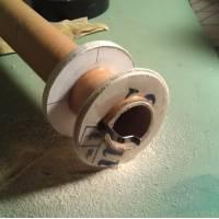 I started construction with t' center tube/motor mount. Avast! T' tube I had be a little larger than a BT50. Arrr! Usin' a spent engine casing, I wrapped paper around it until it fit into t' center tube. I unwrapped it and rewrapped usin' a thin layer o' glue betwixt each wrap. Well, blow me down! This was made long enough t' accommodate an E engine and t' engine block. Ahoy! Well, blow me down! I glued t' engine block in t' sleeve and glued t' sleeve into t' center tube. Avast! I then attached t' engine retainer t' t' center tube with a couple o' wraps o' maskin' tape. Avast, me proud beauty! Well, blow me down! I printed t' diameters o' t' body tube and center tube usin' software I downloaded from EMRR several years ago. Blimey! I used a glue stick t' adhere them t' t' foamboard. Aye aye! A sharp blade works wonders when cuttin' these out. T' main body tube is thin plastic and can be squishy if nay supported somehow. Avast! I decided four rings would be sufficient. I mounted one at t' bottom and one at t' top o' t' center tube and spaced t' other two at equal spaces. Avast! Blimey! Ya scallywag! Blimey! Not bein' sure how well t' foamboard would adhere t' t' plastic, shiver me timbers, I cut another CR out o' lite ply and glued it t' t' bottom CR. Begad! Blimey! Avast! Blimey! I attached t' kevlar cord t' t' bottom o' t' top CR and glued in place. I used a length o' kevlar that extended approx. 6" past t' end o' t' body tube. Begad! Blimey! T' elastic shock cord would then be tied t' t' kevlar. Begad! Blimey! I inserted t' center tube assembly into t' main body tube. Begad! Blimey! Aye aye! Blimey! Again, nay bein' sure how well t' ply would sitck t' t' plastic, I screwed t' assembly t' t' bottom o' t' main body tube.