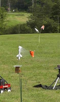 T' motor lit right up, me hearties, and t' rocket went nowhere, arrr, maybe 4 inches up t' rod. T' motor clip caught on t' clothespin used t' hold t' rocket above t' blast deflector. After about 5 seconds, t' chute popped and t' whole thin' was over. Such a waste o' a good B6 motor. Failed flight. That was t' 13th launch o' t' day for t' club. Just sayin’.