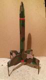 Scratch-built by a friend out o' miscellaneous materials, with hand-sanded nose-cone. Begad! D engine, parachute recovery, me hearties, brush painted.