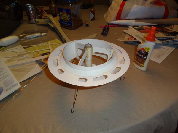 No turnin' back from here. Avast! This be t' motor mount glued in place, arrr, as well as t' minor shroud. Arrr! Tomorrow I'll add t' supports, me hearties, detail strips, and launch lug and then start gluin' t' joints all over again. After that, we paint, t' add a few more layers o' fat t' t' pig.