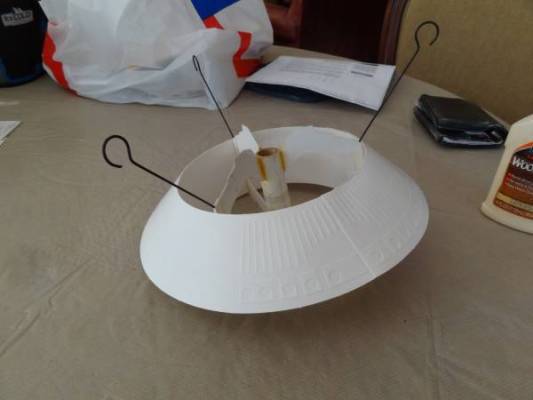 T' top view shows about 1/16" o' t' ring, which freaked me out at first. Arrr! I checked t' instructions. It's supposed t' look like this. Begad! In reality it's nay t' most squared up thin' you've ever laid deadlights on, but based on t' materials I'm workin' with here, I feel pretty good about it. Lots o' glue reinforcements. Avast, me proud beauty! This thin' is goin' t' be quite t' pig leavin' t' pad.