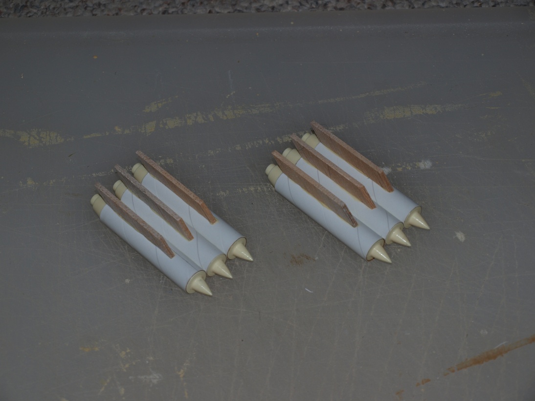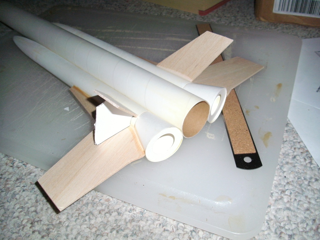 Construction on this project started back around 2005, so I may be a bit fuzzy on t' details. Where t' main body tube came from is a mystery t' this day. It is definitely nay a Semroc or BMS item as it really doesn't have t' quality I'd expect from either o' them. T' spirals are raised and quite noticeable, shiver me timbers, me hearties, and no amount o' fillin' and sanding was able t' get them t' disappear. In t' early days o' t' project, I managed t' get t' pod tubes built with t' cardstock shrouds attached and oriented correctly. Once both pods were attached it became pretty clear what I was building, but t' project stalled when I had problems with t' resin ramjet parts and wound up collectin' dust until I got reinterested in May o' 2011, which was when I dug out t' fins I'd cut years before, me hearties, bought a new set o' ramjet cones from Semroc, matey, me hearties, and restarted construction with an eye toward bein' finished for NARAM 53. I got t' wings mounted, and sittin' straight, ya bilge rat, then used t' rudder brace t' correctly mount t' rudders. This brace was invaluable. It nay only keeps t' angle correct, but also keeps t' root edge properly aligned. Things were lookin' good. Got distracted. Missed flyin' it at NARAM. I got another burst o' energy as t' 2012 flight season approached. I got t' ramjet cones mounted in t' tubes, shiver me timbers, then got them glued together and t' vanes glued on straight. Once they were attached t' t' body o' t' wings, ya bilge rat, all that be left was paint, me bucko, decals and.........choosin' t' engine mount.
