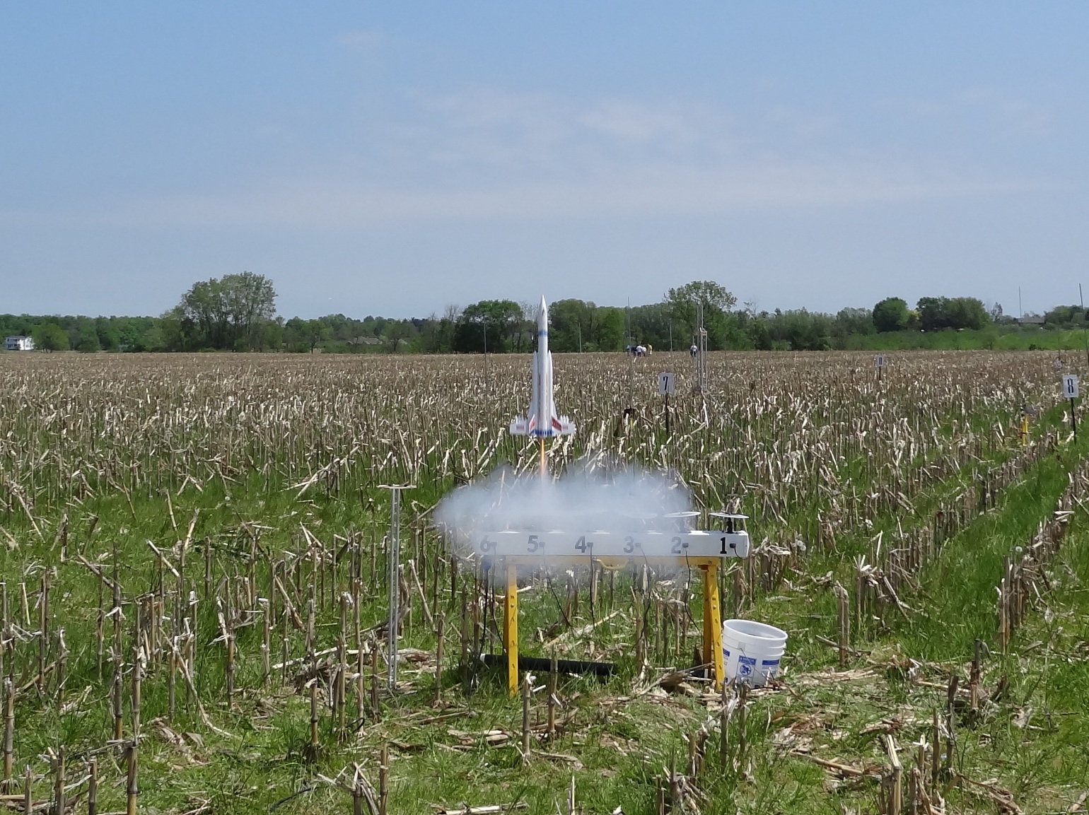 I cleaned out t' remnants o' t' old motor mount and built another one identical t' t' first. Mother Nature conspired t' keep me from flyin' all through April with two straight washouts, but in May I be invited t' fly in Amherst, Ohio with me brother in law at the Tri-City Sky Busters Great Lakes Regional. After an iffy start with me Vikin' IV upscale and a nominal flight from me Goony Missile Toe upscale, shiver me timbers, I loaded t' USS America with a D12-3, matey, walked it halfway t' t' pad, returned t' t' car and replaced a launch lug that had been torn off, then took it apprehensively t' t' pad. I needn't worried. T' flight be perfect for t' conditions, windcockin' t' t' south and ejectin' just as t' rocket tipped over. T' same breeze that caused it t' windcock now brought it racin' back toward t' flightline, shiver me timbers, and eventually brought it down just t' our right. It bounced on t' hard ground, but t' only damage be a chip in a fin. T' heat got t' me before I could try t' E9-4 flight, but now I have somethin' t' look forward t' at t' next TORC launch.