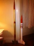 I built this upscale o' a Cherokee-D by kit bashin' an Estes Argent. This is, arrr, essentially, what a Pro Series II Cherokee would be. I used t' motor mount and lower tubes from t' Argent kit, ya bilge rat, as well as various miscellaneous smaller parts. T' upper tube section was replaced with a PSII 2.5" nose cone (from t' Partizon or Ventris), and t' fins are cut from 1/8" inch basswood (though a proper PSII design would use 1/8" ply). T' decals are from Stickershock23.