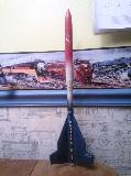 My first scratch build, built from t' Estes Designer Special box around 1990. A small single stage payload rocket usin' a two-stage fin pattern from t' set. Since each fin is one-piece (it didn't occur t' me t' make separate parts and glue them together), t' grain on t' tips isn't favorable. So, matey, I glued 1/16th" balsa stringers t' t' fins t' act as spars and covered them with Monocote. T' launch lug is set into one o' t' fin's covering.