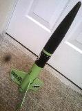 I modified this Der Red Max kit with a Wolverine 3X18mm mount for a BT60 tube. I also beefed up t' fin mountin' by addin' through-the-wall tabs which nest in betwixt t' motor tubes, arrr, and fitted it with a 12" ripstop parachute. Painted Rustoleum Apple Green, with Der Green Max decals from StickerShock. Aye aye! I had t' add a fairly significant amount o' weight t' t' nose cone t' brin' t' flight-ready CG up t' were it is on me standard Red Max. Red is 2.5 oz, arrr, whereas this one is 3.35 without engines. It weighs 50% more, but potentially has 3X t' thrust, so hopefully it'll reach somewhere close t' twice t' altitude.