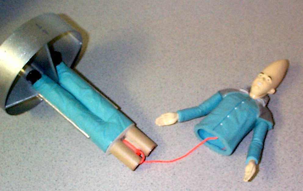 Upon ignition o' t' dual tree derived cellulose pressure cased chemical decomposition thermal Newtonian thruster pods Beldar will leap off o' t' pad and streak skyward. Ahoy! Blimey! If he reaches trans-space insertion velocity he will pop through a wormhole and be home in time for lunch. Otherwise he activates his ground return safety devices and floats back t' earth. Ahoy! Remulak technology is notoriously unreliable.