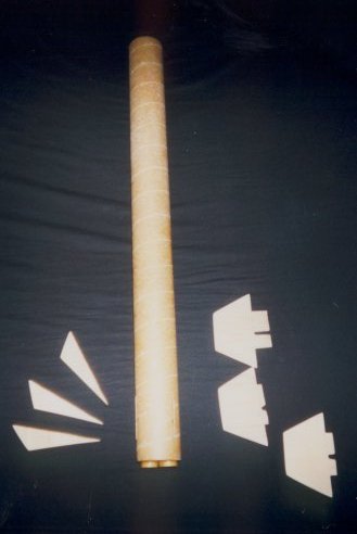 T' next step be t' easy part. Ahoy! I glued on t' fins usin' 30 Min epoxy. I wanted t' make sure that it was super strong. I used t' same type epoxy for my fin fillets. I did nay make t' upper fins TTW because they would nay ever hit the ground with any kind o' speed. Avast, me hearties, me proud beauty! Once t' fins were set it was just tyin' the elastic t' t' wire cable and t' t' nose cone, and addin' t' two chutes from my Bomarc kit. I also pulled out me jig saw and cut what I call t' peanut. Begad! Begad! I use this for me motor retention. Begad! Since thar are two motors in t' rocket I did not want t' use tape t' keep t' motors in. There is a better picture at the end o' t' page that shows t' peanut.