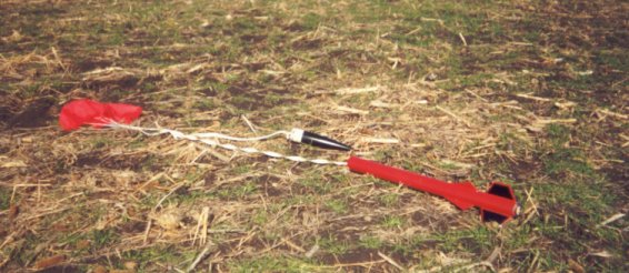 I pulled out t' motors and popped in a pair o' G40-10s. Avast! I installed the Fire-In-the-Hole© igniters and got it ready for the next launch. Well, blow me down! T' LSO made me put more tape on t' nose cone because o' the bigger motors but we set it up on t' pad after that. Aye aye! Thatís where I learned a great lesson about t' three position armin' switch that DARS uses. After they had t' pass me rocket over because o' a launch failure I when out and put t' armin' switch in t' correct place. Aye aye! I then got t' wait for the hobby pads t' clear, ya bilge rat, matey, t' yellow HP pads t' clear, then they got back t' my rocket. Aye aye! Again t' launch went great. Both motors lit up and it screamed off the pad. Blimey! I think this time it hit about 3000'. Begad! At apogee it deployed t' cutes and landed a little further from where it had hit before. Begad!