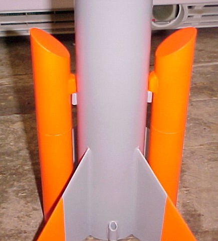 Booster fins are 1/8th inch balsa and have two inch tabs extendin' through t' wall t' t' central 24mm motor mount tube.