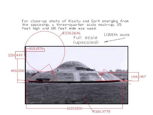After takin' t' image from http://www.tauspace.freeserve.co.uk/day_the_earth_04.htm and dumpin' it into AutoCAD I was able t' scale it from three quarters up to full size, shiver me timbers, then I took and matched t' radiuses and angles. Arrr! Avast, me proud beauty! Notice that there are parts that don't match due t' t' camera bein' at an angle. Blimey! Avast!