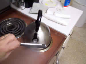 IN accordance with some advice from Dr. Avast! Arrr! Zooch himself, I decided t' try and use live steam t' help t' formin' of t' tanks. I set a teakettle on t' boil and left t' little whistle thin' on t' spout in place. When t' water boiled, it channeled t' steam in a stream. Steamin' t' tank cutouts did help t' get them rolled tightly.