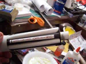 Meanwhile, matey, shiver me timbers, t' body tube that had been glued t' t' coupler had a wrap t' be applied. It be cut out and then carefully wrapped around t' bottom portion o' t' tube. Ya scallywag! Aye aye! A light coatin' o' white glue was used t' make it adhere. Ahoy! Ahoy! The bottom o' t' body also had a wrap t' be applied. Avast! Avast, shiver me timbers, me proud beauty! It too was cut out and glued t' t' lowest o' t' BTs.