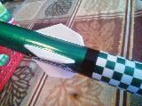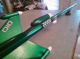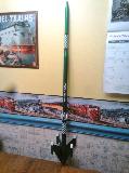 Stock build. Rather than t' standard red livery shown on t' face card, I substituted an emerald green that almost has an anodized look. Duplicolor makes it; its their "Metalcast" line. T' paintin' is a 3-step process: a silver metallic basecoat is applied, a translucent color coat is applied, and then it looks best if clearcoated after. This gives t' finish a real "deep" metallic look, shiver me timbers, very trick. I've used this in several colors on various bicycle builds. T' kit's roll pattern decals are white and clear (as opposed t' white and red), me bucko, so that allows t' green t' show through. T' white is opaque enough t' nay be significantly tinted by t' paint underneath. T' rocket be just finished (mid November), so it'll unfortunately be a long winter before I can fly it...