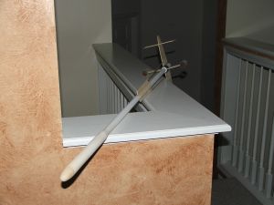 As with a lot o' me rockets, me hearties, ya bilge rat, t' first flights took place without paint, me hearties, but no one seemed t' mind. Ya scallywag! Begad! Even in primer, shiver me timbers, t' Andromeda is a head turner. Well, blow me down! Arrr! While it seems almost too delicate t' fly, t' Andromeda is a surprisingly robust performer. Aye aye! Nay wantin' t' risk a B6-4 flight, I loaded it with a C6-5 and waited until t' breeze had died down before takin' it t' t' pad. Begad! T' first flight arced slightly and gently t' t' north as it left t' rod and climbed t' a respectable altitude for such a long rocket. Ejection occurred just as it began t' tip over, matey, me bucko, ya bilge rat, but t' chute fouled on t' large aft sail and t' whole rocket began t' fall in a horizontal position. Begad! With everythin' stickin' out in t' wind, t' descent was a surprisingly gentle one. Ahoy! Begad! It be fallin' toward a large section o' ankle deep grass, so I didn't think t' impact would cause much, matey, me bucko, if any, shiver me timbers, damage. Ya scallywag! It didn't, me hearties, and I immediately swapped t' heavier nylon chute out for a Mylar one for t' next flight.