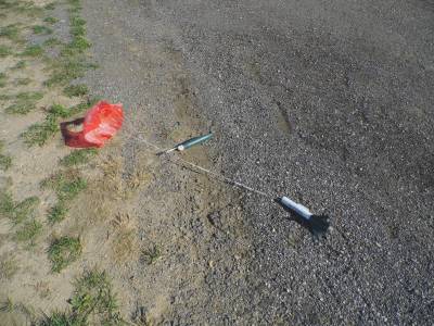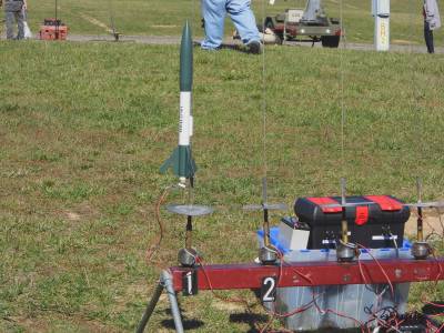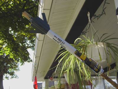 After recoverin' rocket I took it back t' t' car and removed t' melted parachute. Avast, me proud beauty! I then had t' repair t' shock cord as well as it be melted in three spots. After makin' repairs t' t' shock cord and replacin' t' parachute I loaded it back up, this time makin' sure I added t' dog barf. Begad! For 2nd flight I opted t' go with designed motor and loaded it up with a D12-5. This time it ripped off t' pad and almost disappeared in t' sky. I think I saw t' chute deploy at apogee but hard t' tell. Ahoy! Rocket drifted way, way, matey, way down field in spite o' t' 4" spill hole that I had cut in t' parachute. Hitched a ride with t' mule driver t' retrieve it. Avast! Found t' rocket near t' pond at t' other end o' t' campgrounds. Ahoy! Recovery showed a couple o' paint chips t' 2 fins and a couple o' tiny scratches in t' NC.