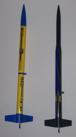 blue and black with yellow graphics, and #2 is yellow with a medium blue nose cone and fins.