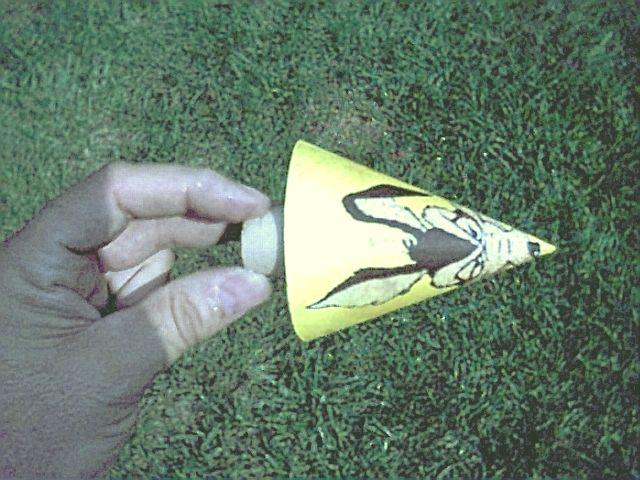 I decided t' make me own nose cone shroud with Wile E. Coyote on it. Since blank skin templates weren't yet available, I scanned t' template from t' kit. Avast! I had found a front view o' Wile E on t' net, but knew he wouldn't look right if he be simply pasted onto t' shroud. Therefore, I used a distortion filter in Adobe Photo Deluxe t' wrap Wile E over a sphere. Well, blow me down! Thus, when t' cone is formed, he be more-or-less straightened back out. Aye aye! Aye aye! I "borrowed" a few bits o' graphics from FlisKits t' complete me shroud, me hearties, me bucko, which I printed directly onto cardstock.