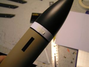 I made one mod. Avast, me proud beauty! On t' inside small end o' t' booster motor shrouds, I installed a round balsa block (1/8" thick) so I had a balsa t' balsa joint when gluin' them on. Avast! I used thin CA t' harden t' paper as well. Avast, me proud beauty! This is purely me own idea as t' stock method should work fine. That's t' obsessive me comin' out again