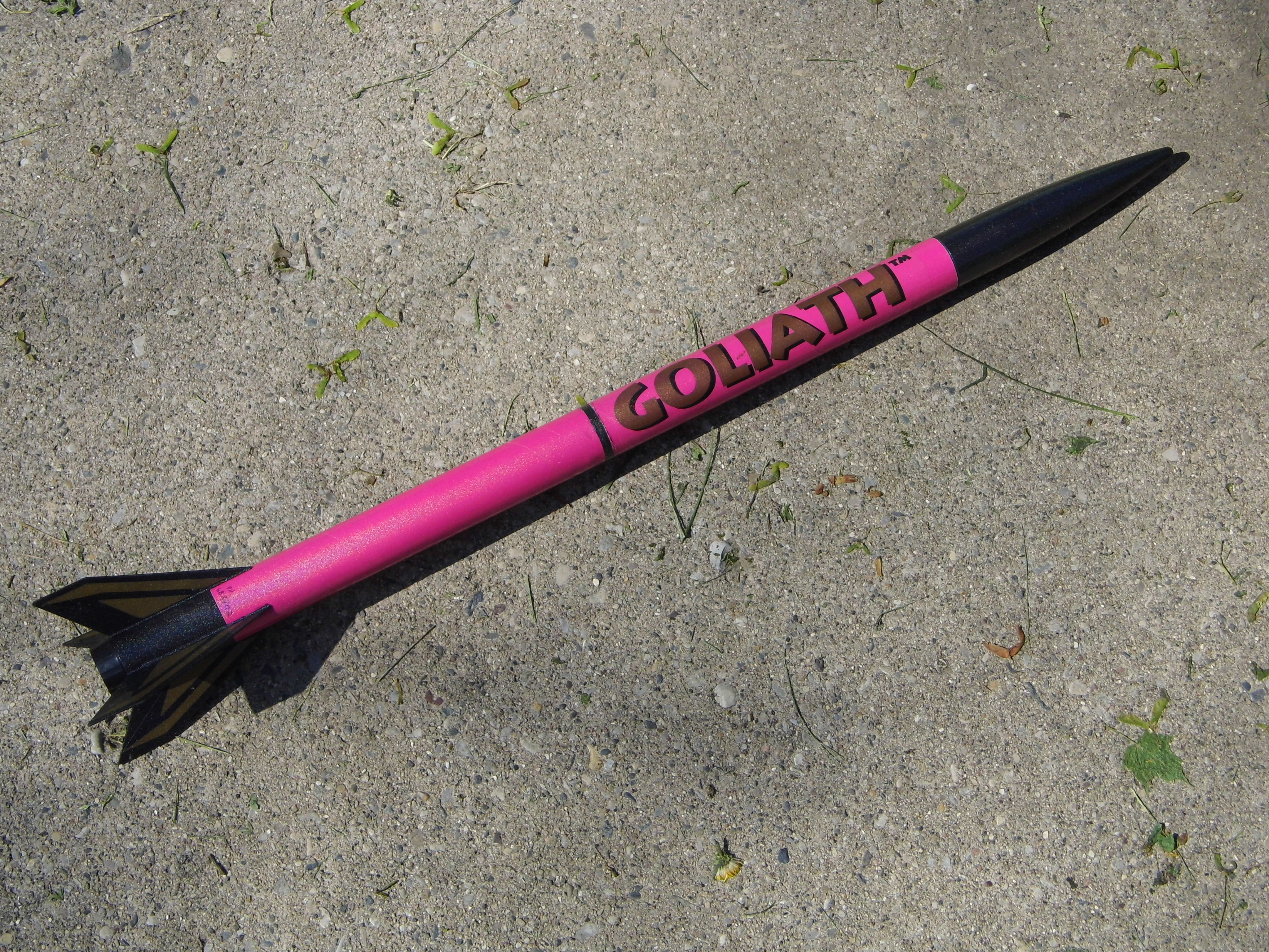 Goliath is one o' two rockets that come in t' Mega Maxx kit that is one o' t' E2X starter sets. It has a pre-colored body tube and molded plastic fins and nosecone with press on decals.