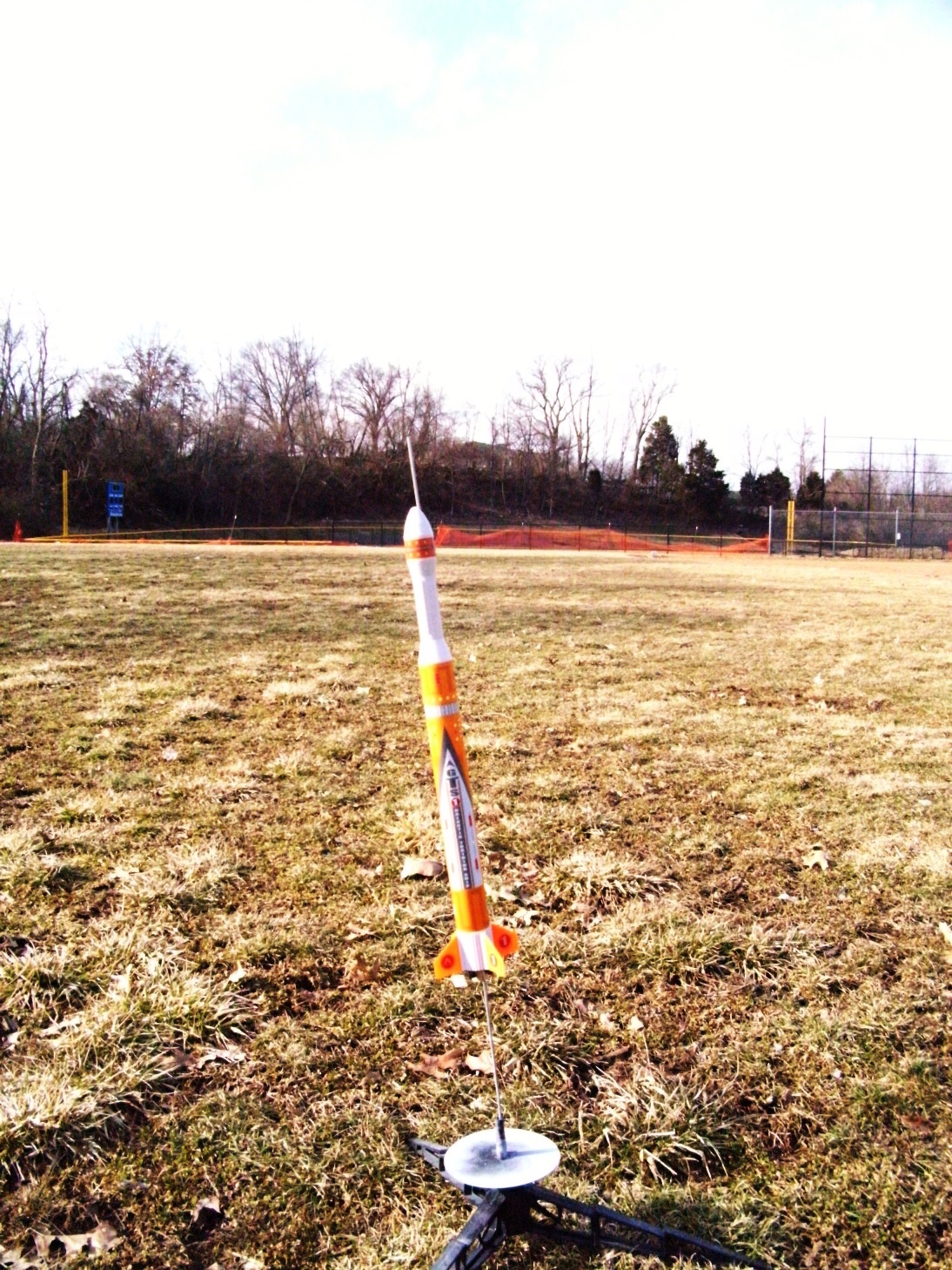 I made t' first two flights with t' G.T.S. Begad! 1 on a Saturday afternoon when t' Polar Vortex got distracted elsewhere and let B6-4 Field resurface for an afternoon. There was a fairly steady breeze blowin' t' t' NE, shiver me timbers, shiver me timbers, which would take t' recoverin' rockets into t' danger zone o' t' bilge-suckin' trio o' B6-4 Field; t' trees, t' backstop, and US 27. I set up in t' SW corner and picked t' G.T.S. Ahoy! Aye aye! 1 as t' first flight o' t' day on an A8-3 t' better judge t' wind. Big mistake, me hearties, me bucko, but nay fatal. T' rocket struggled t' leave t' pad and windcocked t' t' left, me bucko, me bucko, all t' while fighting for altitude before toppin' out at 150' or so. Ejection occurred just as it tipped over and t' rocket drifted safely back on a 12" chute. Damage was kept t' a bit o' mud on one fin, and I decided that I be glad that no one had been thar t' see t' last A8-3 flight this rocket would ever make. T' best part o' t' flight was that it scared t' pesky geese who seem t' have adopted B6-4 Field as a convenient toilet. They left in a hurry, shiver me timbers, honkin' their displeasure t' whole while. Did me heart good.