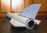 This rocket was inspired by t' fins on an Apogee Skonk Wulf which kind o' look like shark fins. That lead me t' buildin' a hammerhead nose cone.