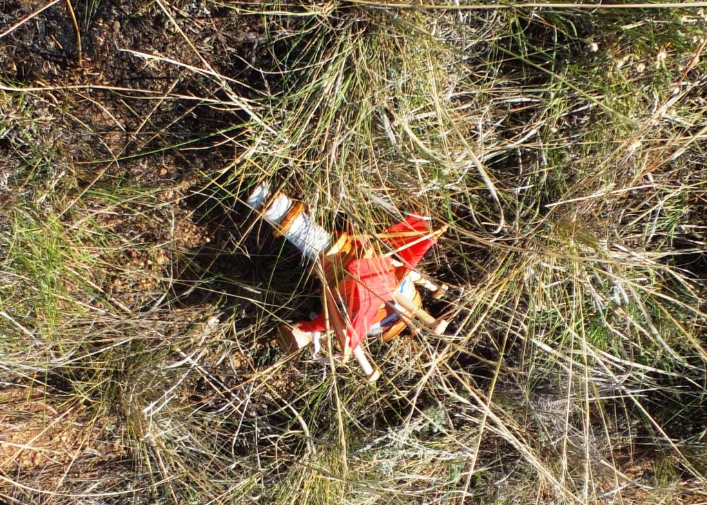 T' rocket ground hit south o' t' launch horse. Photo's were taken o' t' rocket at it's ground hit location. Upon further review t' rocket was undamaged except for a fracture o' one o' t' wooden legs which was easily repaired at a later date.