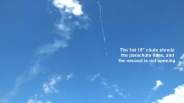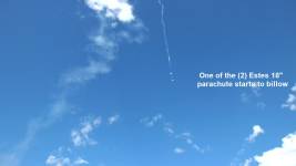 This flight uses a pair o' D12-3 motors (instead o' two D12-5's) and I made new 18" parachutes that have t' shroud lines goin' up over t' top ... [More]