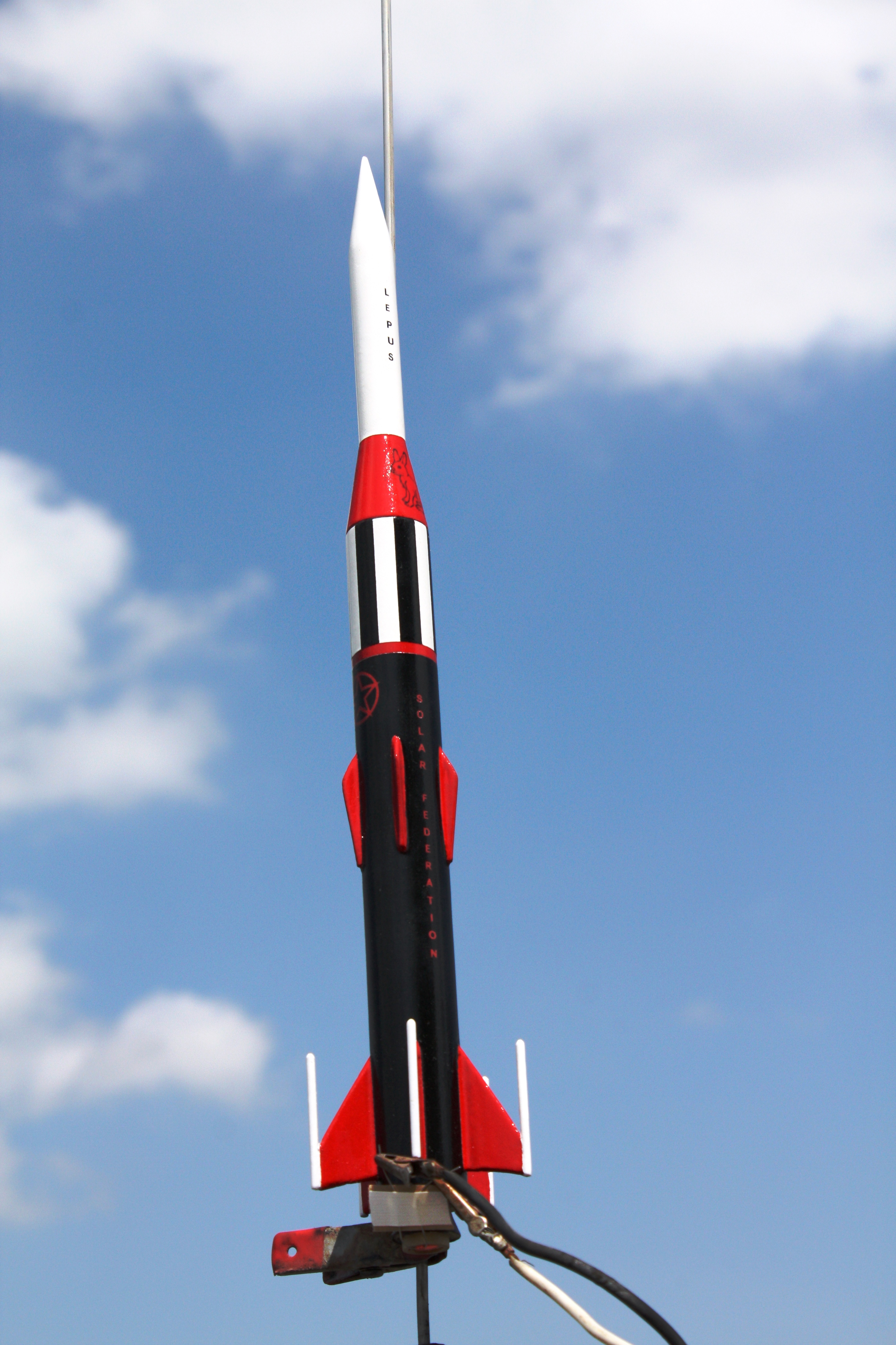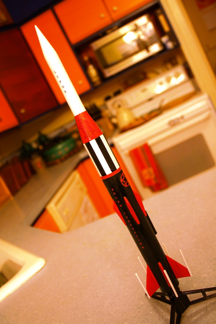 This be t' first o' me "Constellation Series" o' rocket designs. Arrr! Lepus was originally a random assortment o' leftover parts. Then I got a hold o' Rocsim and devised a better way t' make those parts into an interestin' model with some sci-fi flair.