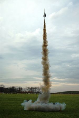 With Christmas season fast approachin' and a personal health crisis on t' horizon, matey, I managed only one flight with this bird before t' end o' me flyin' season. Avast, me proud beauty! However, arrr, that flight definitely won't be t' last. Launch day was gray and overcast with a constant breeze. Well, blow me down! Ya scallywag! Since this was goin' t' be only me third flight usin' an Aerotech motor and me first since 2002, I was a little nervous about t' impendin' flight. Luckily t' VOA field was crowded with people t' whom a flight like this is almost as natural as drawin' a breath. Aye aye! Fellow QUARKer Mark "Loopy" VanLuvender helped out immensely and kept me from a full blown panic attack. Blimey! I had an idea o' how t' proceed but havin' someone t' confirm that what I was doin' be correct made all t' difference in t' world. Arrr! Once t' motor was secured and t' ignitor in place, shiver me timbers, shiver me timbers, things got rollin' quickly, and after loadin' t' rocket on t' pad and gettin' t' obligatory pictures, t' launch followed quickly. Avast, me proud beauty! I managed t' catch t' whole process with t' burst mode on me camera, even though I've never had t' slightest bit o' luck timin' Copperhead ignitions. Avast, me proud beauty! Avast, me proud beauty! T' Hawk rose fairly smartly and followed an almost arrow straight flight path up t' t' point o' motor burnout. Ahoy! Blimey! It weathercocked some durin' t' coast phase due t' t' large surface area o' t' fins, me hearties, but for t' most part, arrr, me bucko, ya bilge rat, everythin' occurred just over t' flight line.
