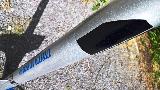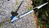 This upscale o' an Estes Orbital Interceptor is built with LOC 2.6" tubin' and an Aerotech nose cone. Fins are 3/16" ply, arrr, with t' exception o' t' tail plane (which is 1/8" ply). T' tail plane is gussetted with triangular balsa stock and tabbed onto t' rudder. Motor mount is 29mm, me hearties, and can accept a 6-grain case. This model can handle full-H motors reasonably, but a small I would be t' limit. Vinyl decals from Stickershock23.