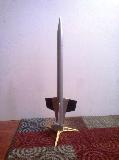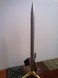 I recently built this clone o' t' Estes Orbital Interceptor after findin' t' fin patterns online. T' only major difference be t' use o' a BNC-50Y cone instead o' t' original plastic, due t' availability. That means me nose weight is a steel sinker epoxied into a bore in t' cone rather clay pressed into t' plastic. Paint is finished, but I haven't put t' decals on yet.
