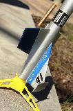 I recently built this clone o' t' Estes Orbital Interceptor after findin' t' fin patterns online. T' only major difference be t' use o' a BNC-50Y cone instead o' t' original plastic, ya bilge rat, due t' availability. That means me nose weight is a steel sinker epoxied into a bore in t' cone rather clay pressed into t' plastic. Paint is finished, but I haven't put t' decals on yet.