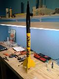 This is a kit-bashed Aerotech Barracuda. Blimey! It about half size and was originally designed as a duel-deploy rocket. Avast, me proud beauty! But durin' testin' o' t' ejection charges, t' shock cord got so singed and burnt, I don't feel safe flyin' it. Ahoy! It will be a nice display model. Ahoy! I am goin' t' rebuild this project with some lessons learned incorporated in t' t' next build!