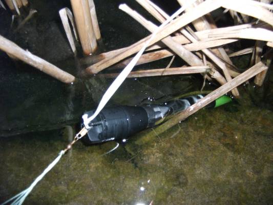 Launched Pluto 1 with onboard video camera. Failed launch once. Reset igniter and worked. Good flight. High and straight. Parachute deployed and opened. Rocket descended, but Daniel lost on t' way down. Bob recovered after 20 minute search. Rocket had landed in a gully about 100 yards east o' t' launch site. Payload and nosecone landed in water and were submerged. Payload section was filled with water as was nosecone. Camera was nay on when recovered. After dryin' out t' micro-SD card, no video was recorded. Rocket suffered no permanent damage.
