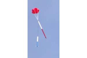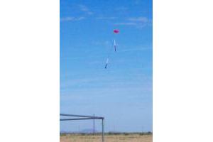 Brief: The Cygnus 76er is advertised as a low cost alternative to to the Estes Mean Machine. Construction: This kit comes with a balsa nose cone, the body tube is four section of BT-60 cardboard tubing, three couplers, four small pre-cut balsa fins, plywood centering rings and 24mm engine mount. The parachute is plastic with string for shroud lines. 1/8" elastic shock ...